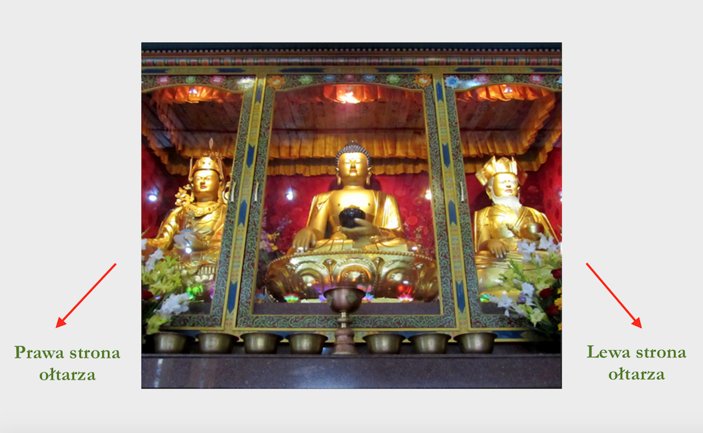 Jeśli symbole ciała, mowy i umysłu mają być na tym samym poziomie, tekst dharmy i stupa powinny być po obu stronach Buddy. Ołtarz ma lewą i prawą stronę i ważne, żeby tego przestrzegać. Tekst dharmy powinien być po prawej stronie [na prawo od prawej ręki Buddy], a stupa po lewej stronie wizerunku Buddy znajdującego się pośrodku.