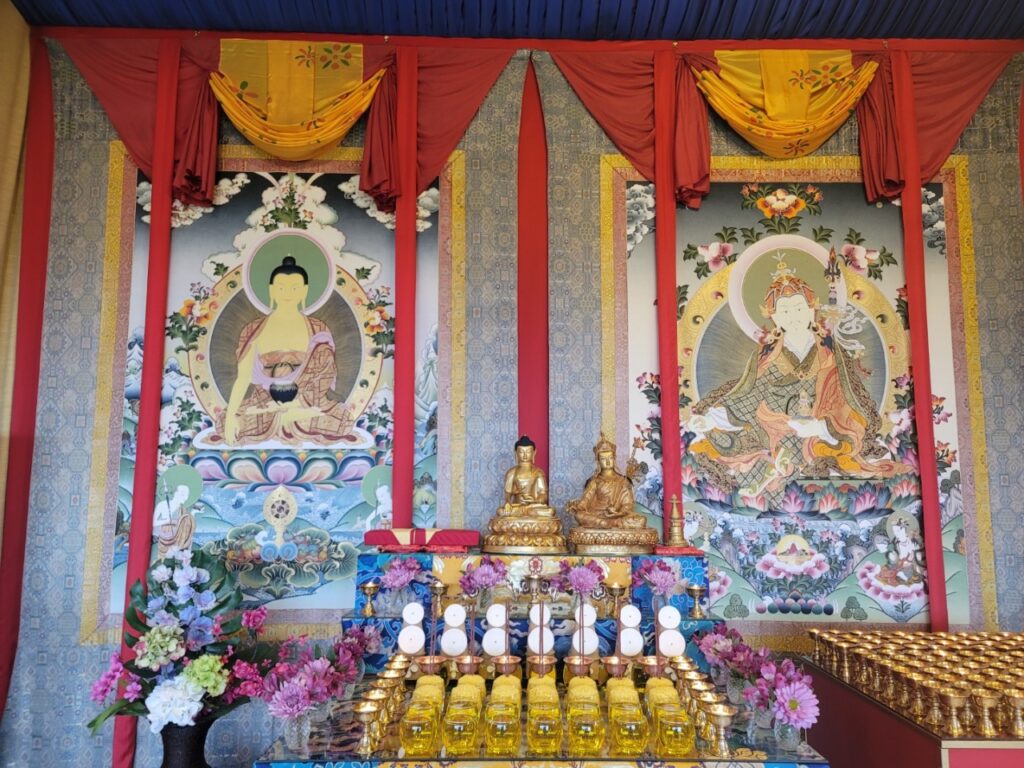 Można powiedzieć, że są dwa rodzaje ołtarzy. Pierwszy – prosty: święte miejsce w waszym domu z symbolami Trzech Klejnotów. To może być półka na książki, wyższy stół albo tradycyjny ołtarz. Z jednym poziomem czy więcej, prosty ołtarz jest zawsze wysoki, a jego podstawa sięga wysokości piersi lub wyżej. Na tym poziomie zazwyczaj stawiamy ofiary. Wszystkie symbole umieszczamy jeszcze wyżej, na przykład na obłożonych papierem pudełkach. Na ołtarzu o dwóch poziomach, symbole ciała, mowy i umysłu znajdują się na drugim albo nawet na wyższym poziomie.